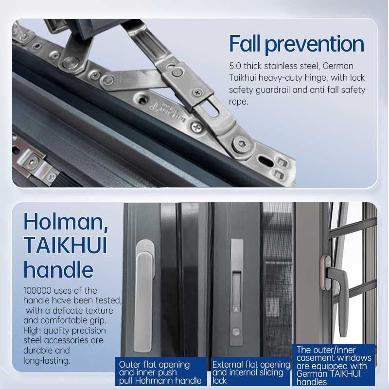Ο κρυφός σχεδιασμός αποχέτευσης έχει αντέξει στη δοκιμασία των βίαιων καταιγίδων. Οι οπές αποστράγγισης είναι πολύ κρυμμένες. Ο σχεδιασμός της εξόδου αποστράγγισης μπορεί να μεγεθυνθεί για να αυξηθεί ο όγκος αποστράγγισης και η ταχύτητα αποστράγγισης. Όχι μόνο διασφαλίζει τη συνολική αισθητική, αλλά επίσης αποτρέπει αποτελεσματικά το νερό της βροχής να διεισδύσει στο δωμάτιο και είναι χωρίς θόρυβο. . 304 Το πλέγμα King Kong ή το πλέγμα υψηλής διαπερατότητας παρέχει αντικλεπτική και αντικουνουπική προστασία. Οι λεπτομέρειες του προϊόντος αντικατοπτρίζουν την ποιότητα, όπως μεντεσέδες ασφαλείας κατά της πτώσης, αντιβακτηριδιακές λαβές και σχέδια με αιχμηρές άκρες, τα οποία παρέχουν ολοκληρωμένη προστασία ασφάλειας για την οικογένειά σας.
