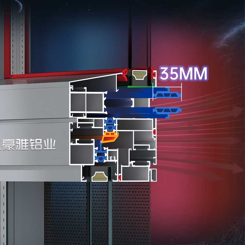 Το Haoya Aluminum κορυφαία παράθυρα αλουμινίου με κασετίνα αλουμινίου της σειράς Fengshen 108 με πλέγμα γάζας, το οποίο χρησιμοποιεί κράμα αλουμινίου από πυρίτιο τιτανίου 6063-T5 και συμμορφώνεται με τη νέα δομή προφίλ εθνικού προτύπου. Το πάχος τοιχώματος προφίλ είναι 1,8 mm. Μέσω προηγμένων διαδικασιών ψεκασμού ηλεκτροστατικής σκόνης ή φθοράνθρακα, τα παράθυρα παρουσιάζουν εξαιρετική αντοχή στις καιρικές συνθήκες, όπως αντοχή στο ξεθώριασμα, τη διάβρωση και την ανθοφορία. Η δομή πέντε κοιλοτήτων συνδυάζεται με μονωτικές λωρίδες διπλής στρώσης πολλαπλών κοιλοτήτων πλάτους 35 mm για να επιτευχθεί εξαιρετικά θερμομονωτικό αποτέλεσμα και να διασφαλιστεί ότι το παράθυρο έχει ισχυρή θερμομονωτική απόδοση.