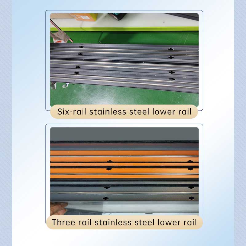 Τα παράθυρα διαθέτουν σχεδιασμό τροχαλίας διπλής σειράς, εξασφαλίζοντας ομαλότερη ολίσθηση και βελτιωμένη φέρουσα ικανότητα. Οι ράγες με ένθετα από ανοξείδωτο χάλυβα, με πάχος 3,0 για την κάτω τροχιά, διευκολύνουν την απρόσκοπτη και αθόρυβη ολίσθηση. Η προσθήκη μιας άκρης που εμποδίζει το νερό ενισχύει την αντοχή στο νερό και αποτρέπει την ανάστροφη ροή.