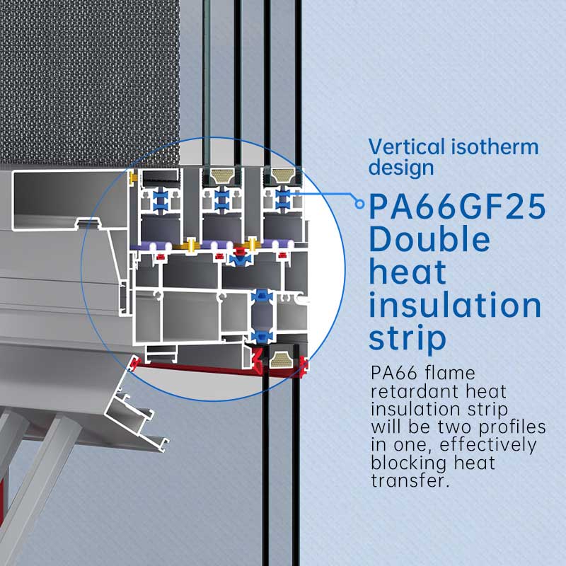 Ο σχεδιασμός της ισοθερμικής επιφάνειας διαθέτει τυπική νάιλον θερμομονωτική ταινία, ενισχυτική ηχομόνωση και θερμομόνωση. Ο σχεδιασμός του φύλλου παραθύρου 2 σε 1 αποτρέπει την αποκόλληση και τη σύγκρουση, διασφαλίζοντας τη μακροπρόθεσμη ανθεκτικότητα του φύλλου και του πλαισίου. Τα χαρακτηριστικά ασφαλείας περιλαμβάνουν μηχανισμούς κατά της πτώσης και της αποκόλλησης, διασφαλίζοντας την ασφάλεια της δομής του παραθύρου.