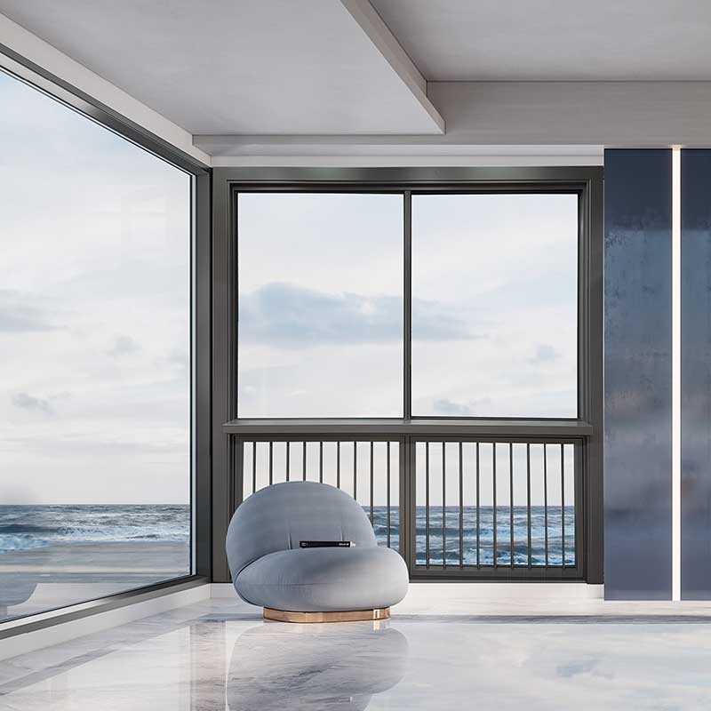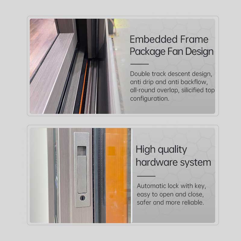 Τα παράθυρα διαθέτουν σχεδίαση χαμηλώματος διπλής τροχιάς, αποτρέποντας τη διαρροή νερού και την αντίστροφη ροή, με αρμούς γύρου πλήρους επιφάνειας και διαμόρφωση μαλλί σιλικόνης για ολοκληρωμένη κάλυψη. Οι τυπικές επιλογές γυαλιού περιλαμβάνουν μονωτικό γυαλί 5+12A+5 για ανοιγόμενα παράθυρα και 5+15A+5 για σταθερά τζάμια, δημιουργώντας μια αποτελεσματική ζώνη ηχομόνωσης.