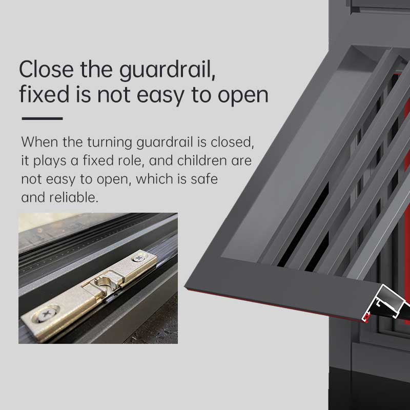 Το κλειστό προστατευτικό κιγκλίδωμα παρέχει πρόσθετη ασφάλεια και όταν κλείνει, λειτουργεί ως σταθερό φράγμα, δυσκολεύοντας το άνοιγμα των παιδιών, εξασφαλίζοντας ασφάλεια. Η δομική γραμμή πίεσης ασφαλείας μπορεί να αντέξει την ισχυρή πίεση ανέμου, με αντοχή εφελκυσμού και διαρροής πέντε φορές μεγαλύτερη από αυτή των συνηθισμένων 50 παραθύρων, εξασφαλίζοντας ασφάλεια έναντι της πίεσης ανέμου.
