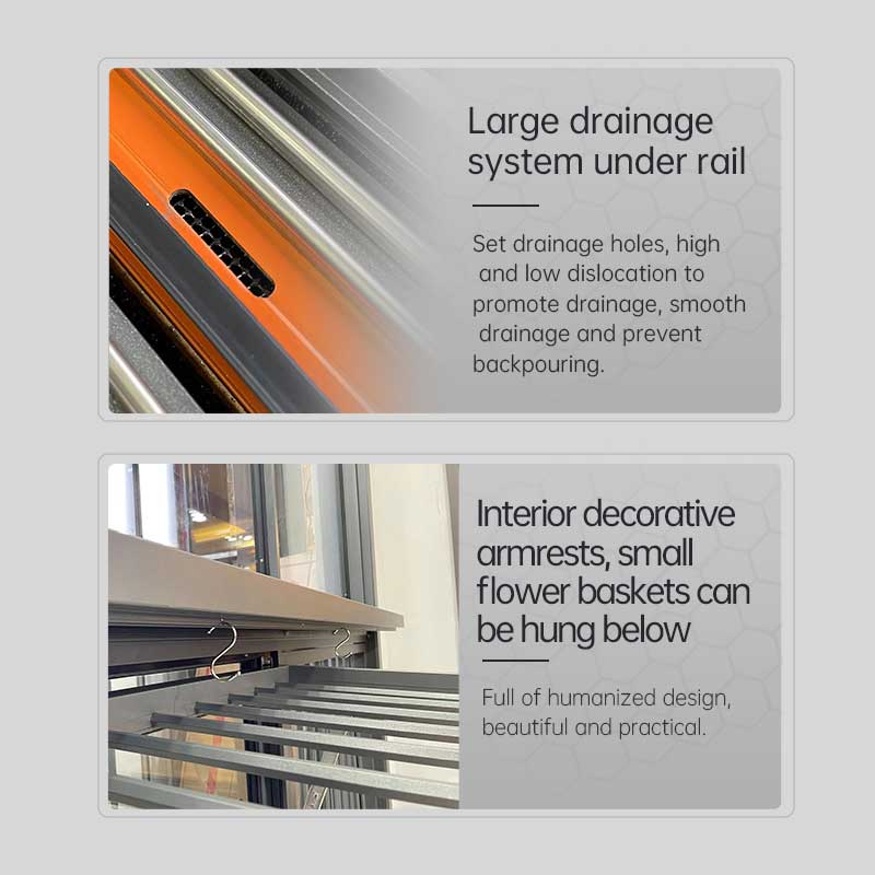 Η χωνευτή δομή του εσωτερικού σκελετού και του φύλλου, μαζί με το σχέδιο πτύχωσης, εξασφαλίζει σταθερότητα και αντοχή στην πίεση του ανέμου, ειδικά σε πολυώροφα κτίρια. Το σύστημα αποχέτευσης με πάχος κάτω ράγα 2,5 mm και οπές αποστράγγισης αποτρέπει τη διαρροή και την αντίστροφη ροή νερού, εξασφαλίζοντας ομαλή αποστράγγιση.