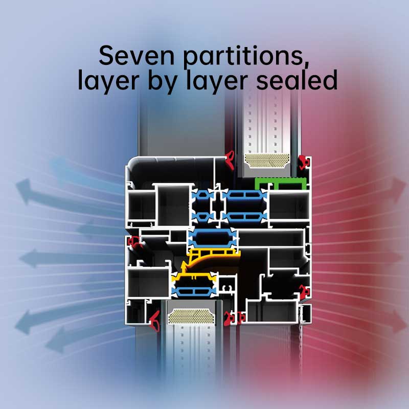 Ο σχεδιασμός στενού πλαισίου με ορατή επιφάνεια 42 mm για το γυάλινο φύλλο και 35,5 mm για το φύλλο γάζας ενισχύει τη διαφάνεια και το φωτισμό, προσφέροντας μια νέα εμπειρία όρασης και αφής. Ο σχεδιασμός τριών στεγανοποιήσεων εξασφαλίζει εξαιρετική θερμομόνωση, με στεγανοποιητική ταινία, ισοβαρικές λαστιχένιες λωρίδες και θερμομονωτικές ταινίες που παρέχουν εξαιρετική αεροστεγανότητα.